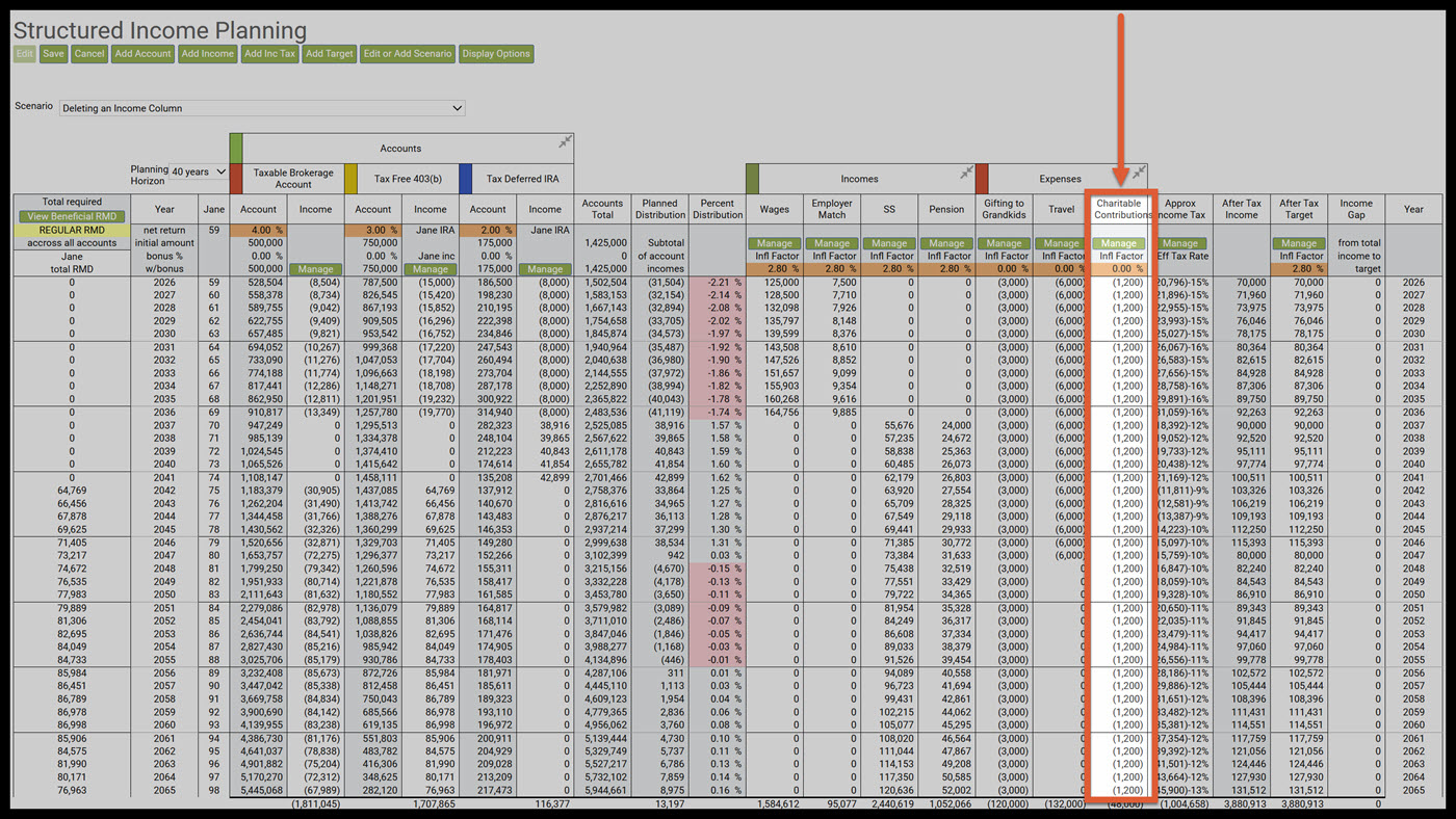 Step 1: Charitable Contributions Expenses Column: The Charitable Contributions is the expense column we will be removing. To learn more about the Add Income/Expenses function, see the section: Add Income