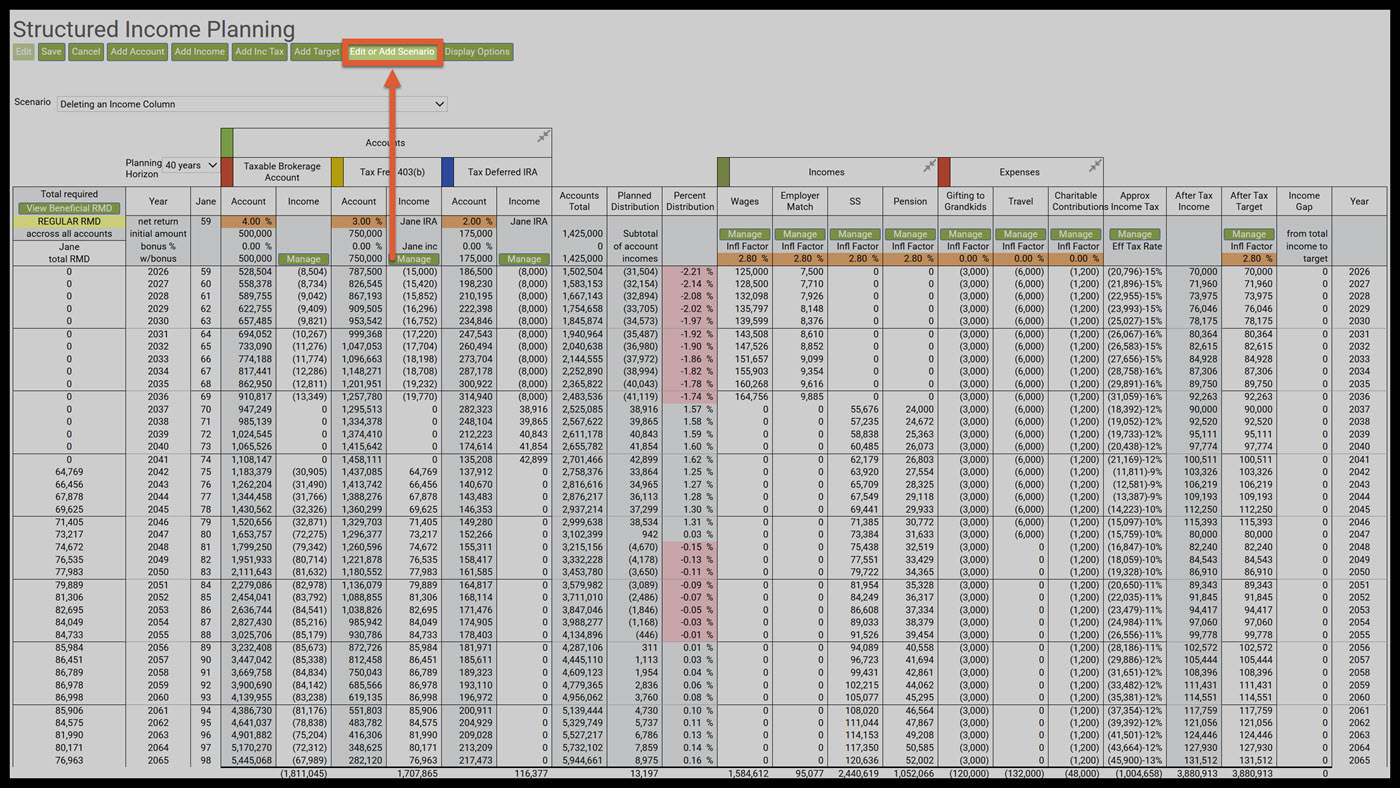 Step 2: Edit or Add Scenario: Click on the green Edit or Add Scenario button under the Structured Income Planning heading. To learn more about Edit or Add Scenario function see the section: Edit or Add Scenario