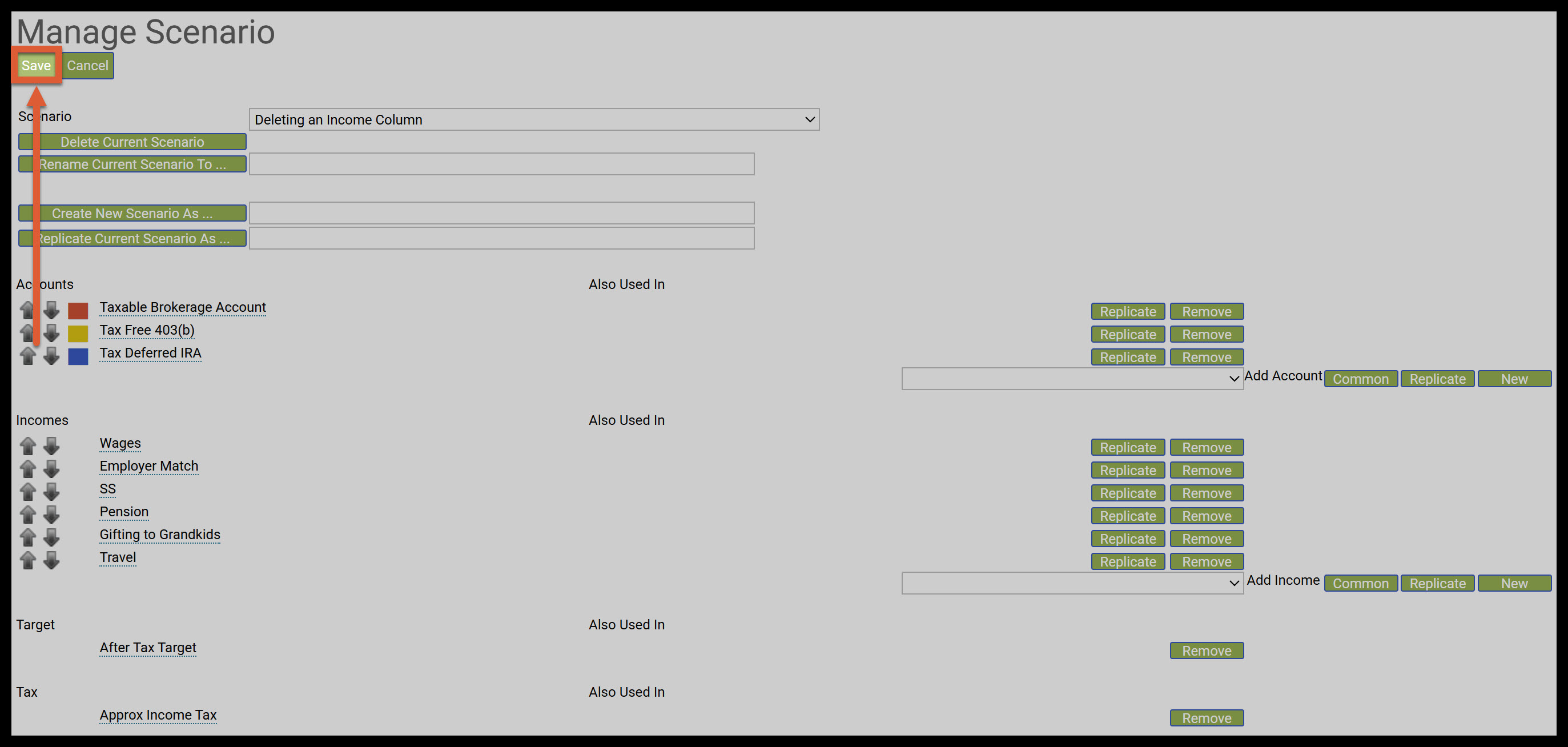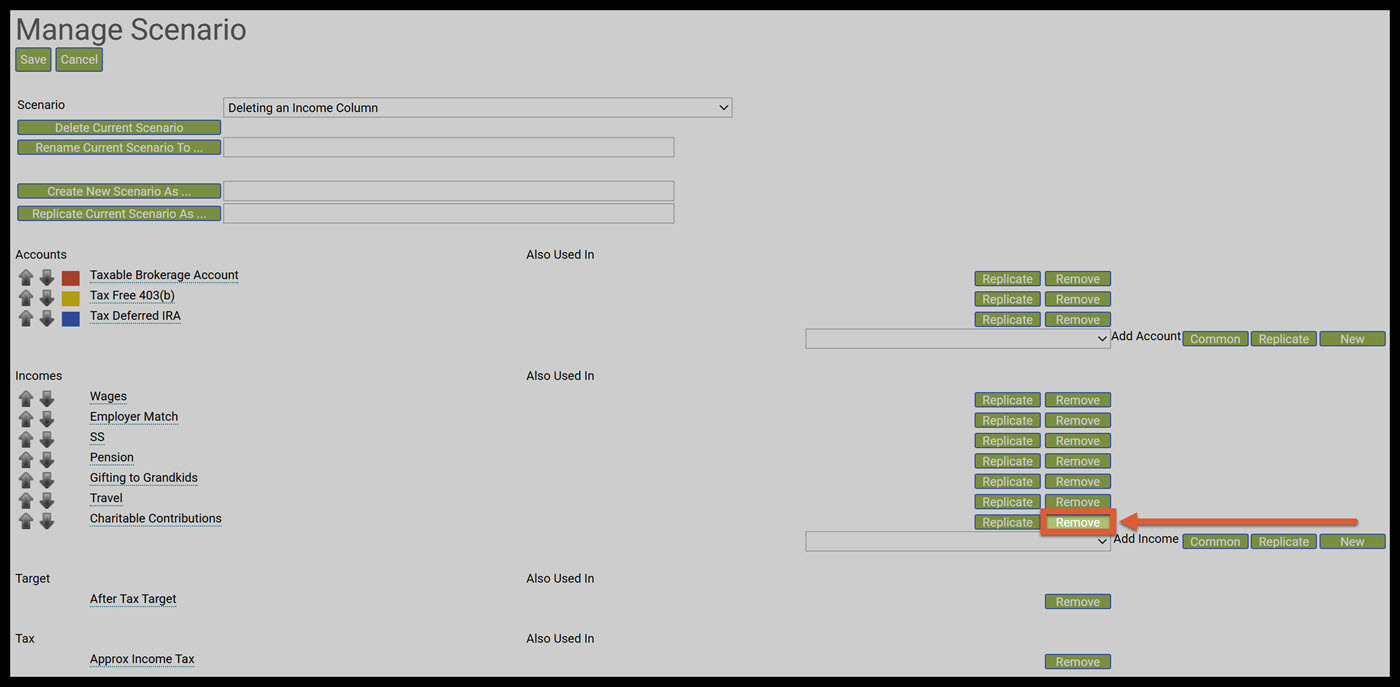 Step 3: Remove: Click on the green Remove button next to the income or expense column you want to delete. To learn more about the Remove function see article: Removing an Individual Item on the Manage Scenario Page