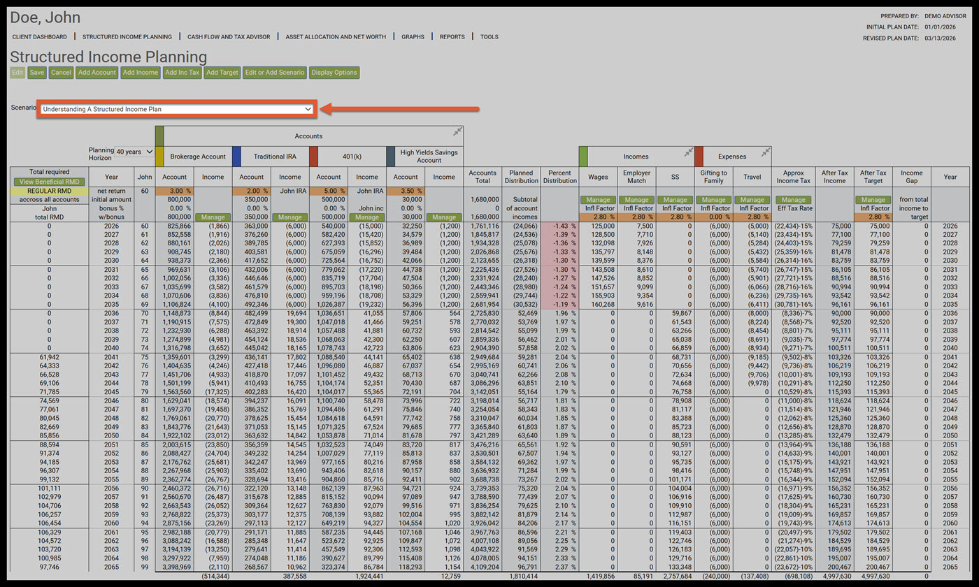 Once you complete the Client Dashboard sections (Client Information, Incomes, and Assets) and select Create Planning Scenario from the Assets page, SIPS will automatically take you to the Structured Income Planning page. This how to article will explain every feature on the landing page. Below is the hypothetical example we will use.