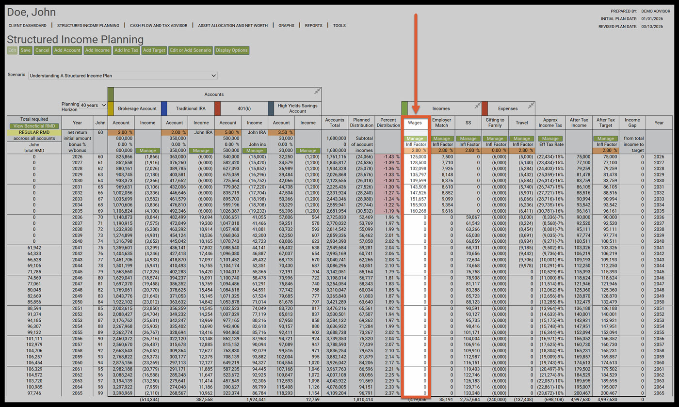 Step 16: Wages: This column is part of the income section and represents the client’s yearly wage. The orange section displays the annual growth rate for the yearly wage increase. The starting wage amount corresponds to the value entered on the Income page. Similarly, the annual growth rate is initially populated based upon the percentage specified on the Income page in the Client Dashboard. To learn more see article: Tax Calculation Option for Incomes