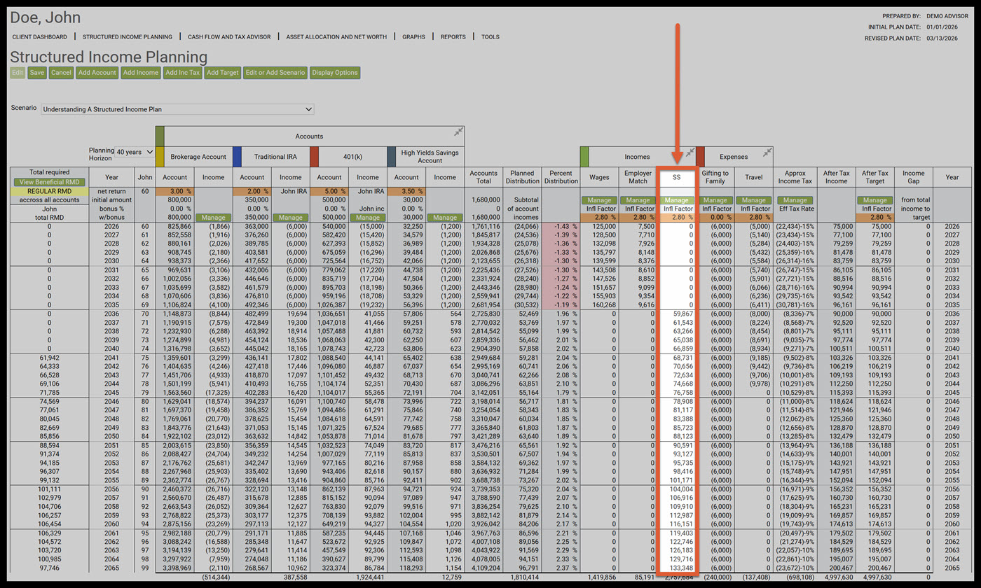 Step 18: SS: This column represents the Social Security income. The income begins based upon the age specified for this income in the structured income plan. You can change the start date for Social Security using the "Manage" button for the Social Security Income. The orange section displays the annual growth rate for this income.