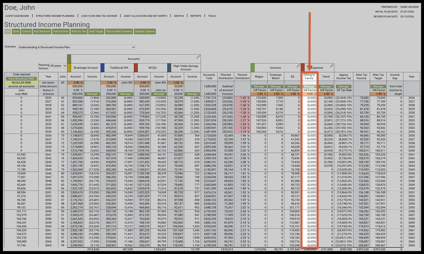 Step 19: Gifting to Family: Expenses are modeled as negative income. The orange section displays the annual growth rate for this expense. Since this amount is an expense, it is displayed as a negative number. To learn more see article: Adding Expenses to the Structured Income Plan