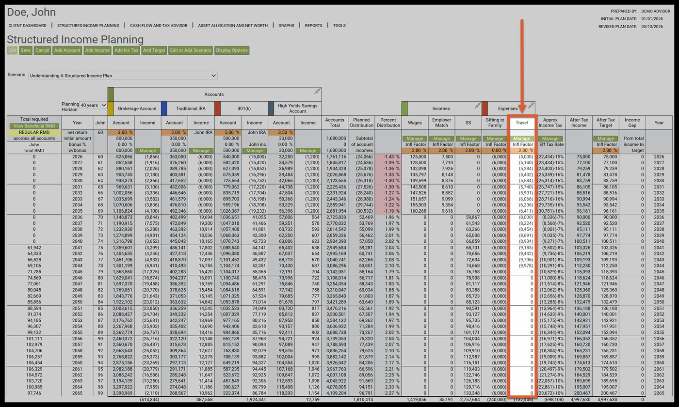 - Travel: While working at $5,000 with an inflation factor of 2.8%, while in retirement start at $8,000 with an inflation factor of 2.8% until age 80.